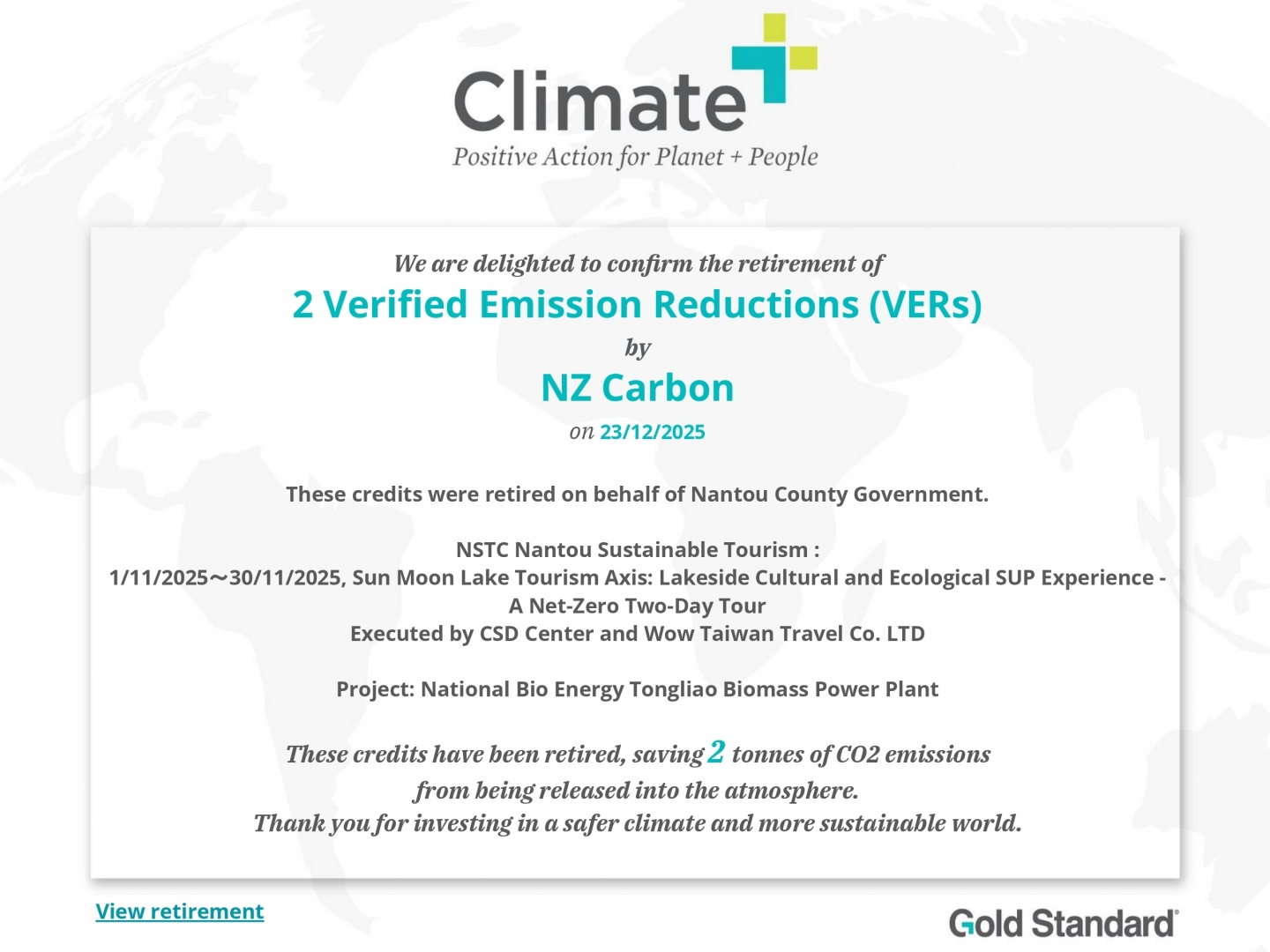 此行程據國際標準ISO 14067進行碳足跡盤查,計算碳足跡排放為一人 27.6 kgCO2e。並以透過購買黃金標準 Golden Standard(GS)認證碳權進行抵換,實踐真正的低碳旅遊。本行程將以淨零為目標持續降低碳足跡。