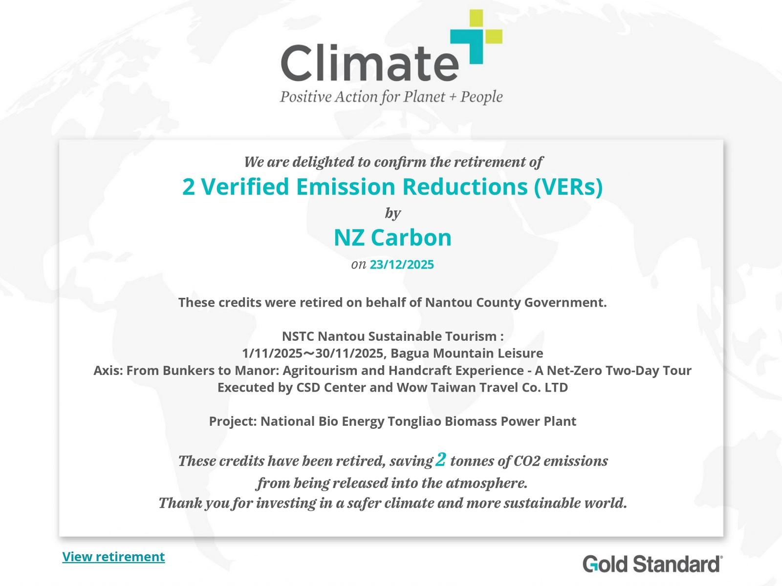 此行程據國際標準ISO 14067進行碳足跡盤查,計算碳足跡排放為一人 29.9 kgCO2e。並以透過購買黃金標準 Golden Standard(GS)認證碳權進行抵換,實踐真正的低碳旅遊。本行程將以淨零為目標持續降低碳足跡。