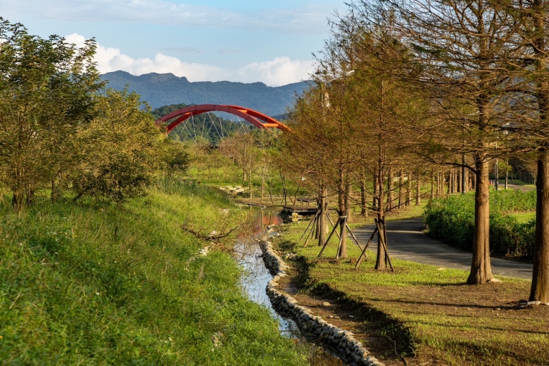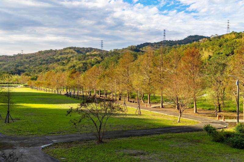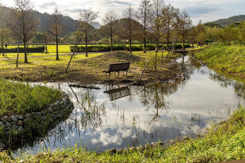 以落羽松為主軸,貢寮環保公園內種植成列的落羽松、黃金風鈴木及各類原生喬木,每到秋冬,生態池畔的落羽松漸染紅妝,映襯著公園四周的自然景色,是公園一年中最迷人的畫面。貢寮環保公園引入生態滯洪池概念,重新設計水道流向,與落羽松林整合為特色景觀,再透過濱水植物的栽植、步道的串聯,以及遠方的山景相合,坐在公園裡的椅子上,你會被此開拓的景色與綠意所吸引,貢寮環保公園,名字不好聽但真有料。