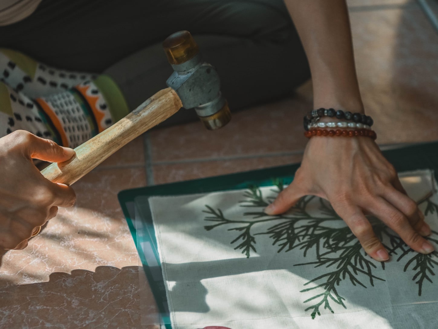 槌染手作體驗|把大自然敲進布裡回到「中寮之藝」工坊,開始今天最具創作感的活動。在植物敲拓老師的帶領下,你會撿拾葉片、花瓣,再用小槌敲打出專屬自己的圖案。每一次敲擊都是不可複製的創作,葉子脈絡的線條、花瓣的色澤,都真實地留在布上。最後,你會帶走一件「只有你擁有」的自然藝術品。它記錄著光影、森林、你的旅程與當下的心情。