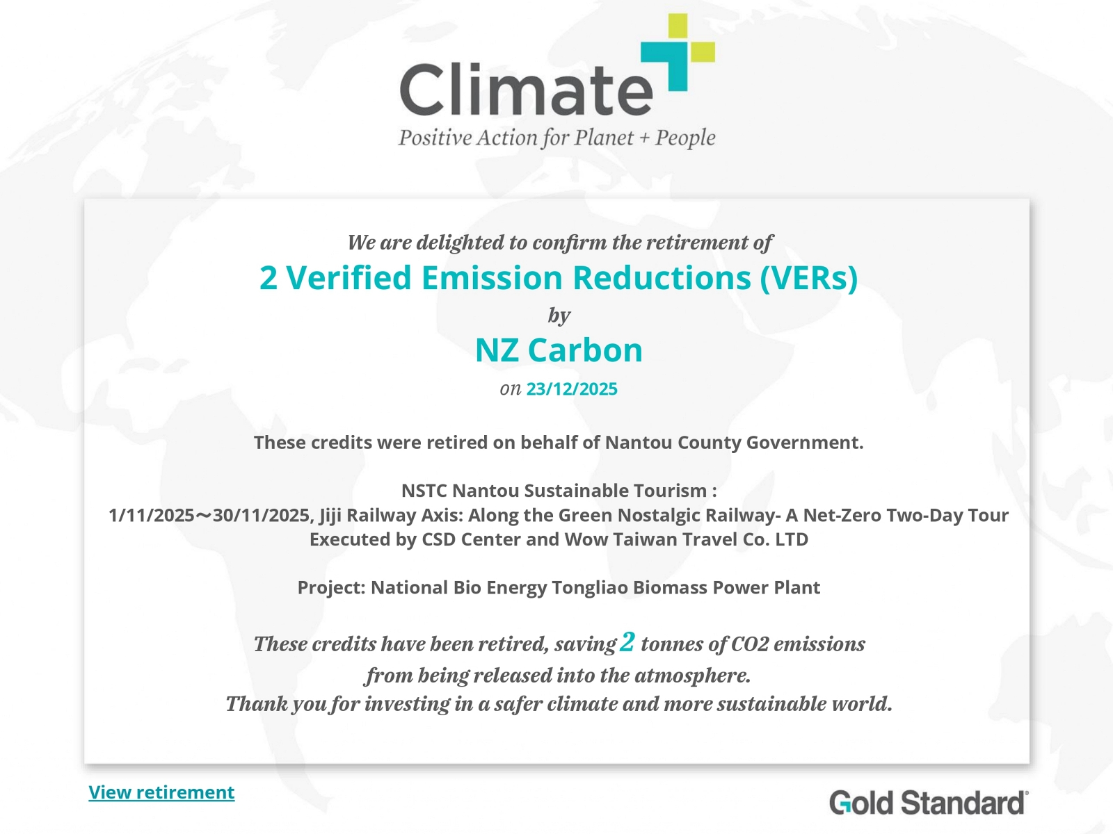此行程據國際標準ISO 14067進行碳足跡盤查,計算碳足跡排放為一人 28.6 kgCO2e。並以透過購買黃金標準 Golden Standard(GS)認證碳權進行抵換,實踐真正的低碳旅遊。本行程將以淨零為目標持續降低碳足跡。