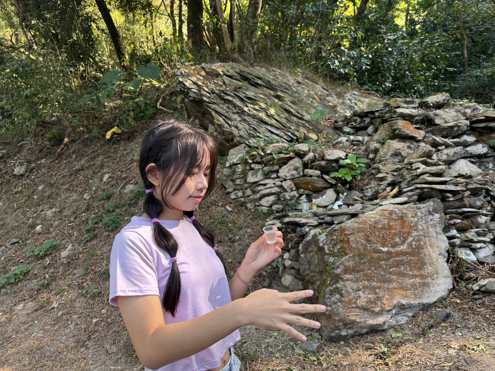進入部落之前,由族人帶領大家先向祖靈祭祀,準備小米酒與檳榔表達心意。爾後,用手點一些小米酒後灑點出去,再將手中的小米酒一飲而盡。簡單的儀式,卻展現了對大自然的尊敬之意。